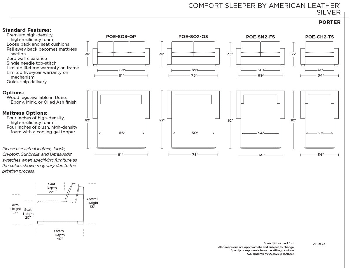 The Comfort Sleeper® Silver is quality you can count on featuring a limited lifetime warranty on the frame and 5-year limited warranty on the mechanism. The Comfort Sleeper Silver features 4" plush, high-density high-resiliency foam mattress or upgrade to four inches of plush, high-density foam with a cooling gel topper.